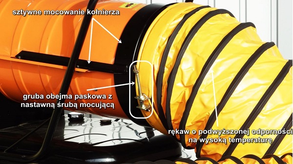 Przewód mocujemy do dodatkowej obręczy montowanej na wylocie nagrzewnicy. Po nałożeniu przewodu elastycznego na obręcz mocujemy ją opaską ze śrubą nastawną:
